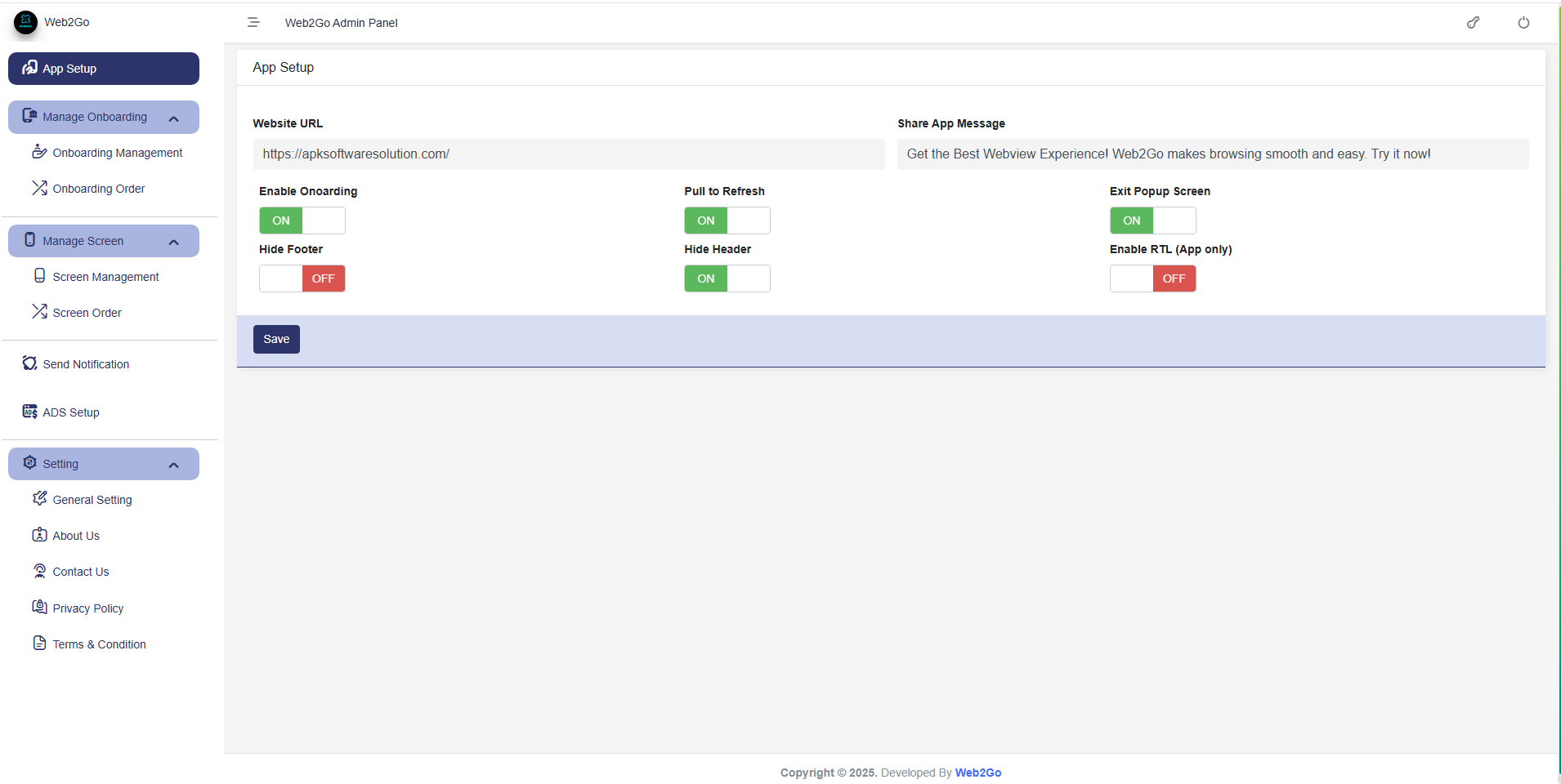 The Web2Go Admin Panel is built using CodeIgniter 4 (CI4) and provides a centralized control and manage your mobile app's key features—without writing a single line of code.