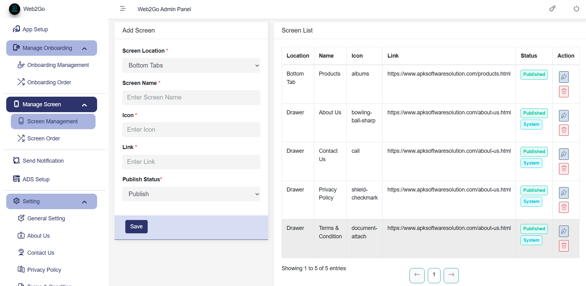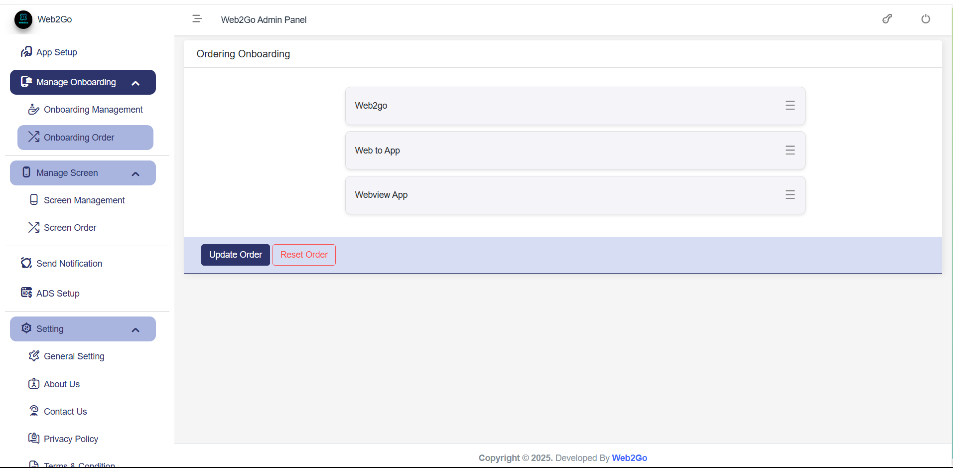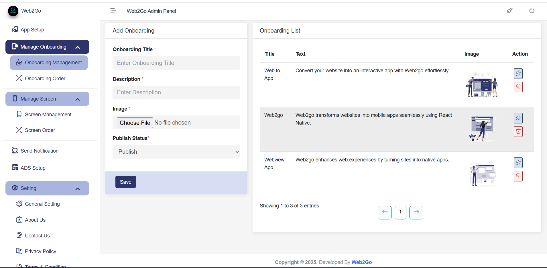 The Onboarding Screen Management section in the Web2Go Admin Panel
