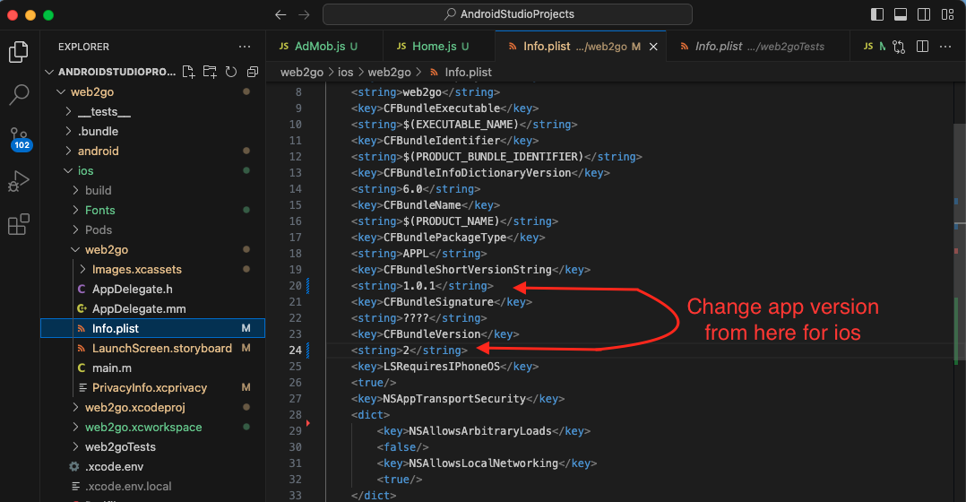 Open web2go_android_ios_app_v2.5 => web2go => ios => web2go => info.plist file