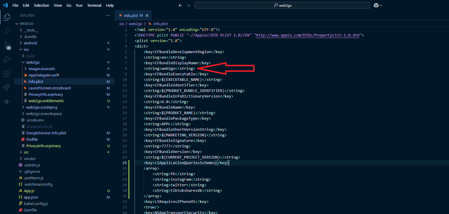 • Open web2go_android_ios_app_v2.5 => web2go => ios => web2go => info.plist file